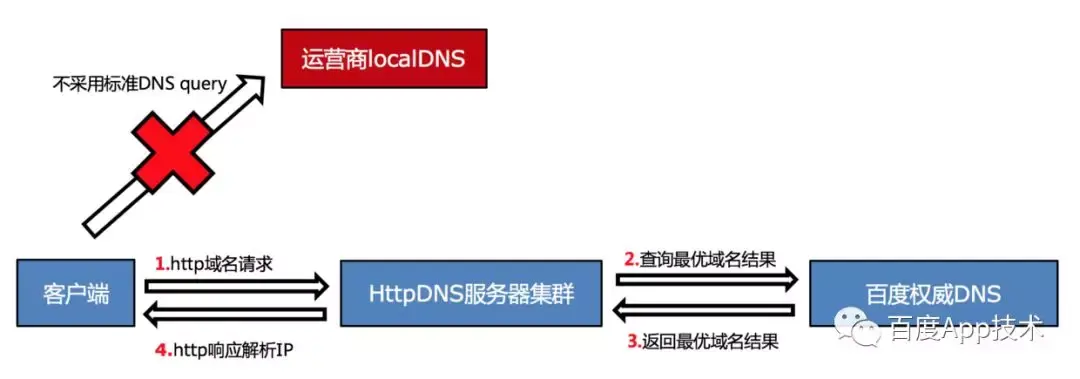 大部分标准DNS都是基于UDP与DNS服务器交互的,HTTPDNS则是利用HTTP协议与DNS服务器交互,绕开了运营商的Local DNS服务,有效防止了域名劫持,提高域名解析效率,下图是HTTPDNS的原理。