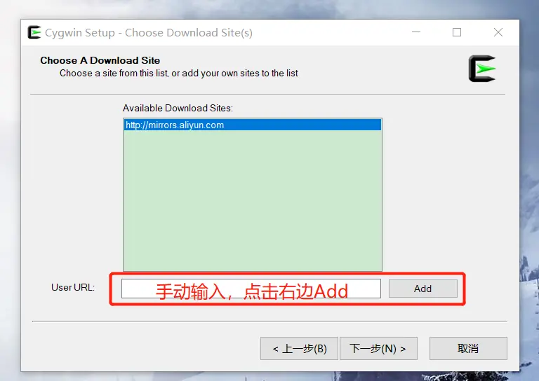 一路next 下去就行了,中途镜像的时候添加阿里的源,输入http://mirrors.aliyun.com/cygwin/,然后点击旁边的Add。