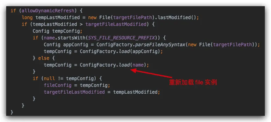 获取 file 最后更新的时间值 tempLastModified,然后对比对比缓存值 targetFileLastModified,如果 tempLastModified > targetFileLastModified,说明期间配置有更改过,这时就重新加载 file 实例,替换掉旧的 fileConfig,使得后面的操作能够获取到最新的配置值。