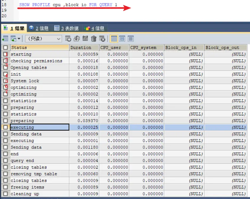 explain过后,我们能通过show profile更精准的找到影响语句执行的出处