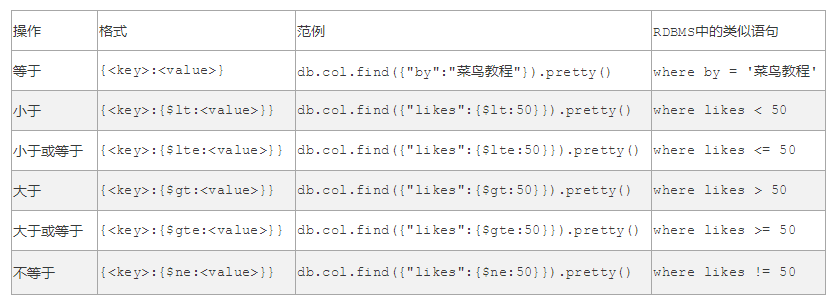 > db.col.find({"by":"小罗技术笔记-专注于开发技术的研究与知识分享", "title":"MongoDB 教程"}).pretty()