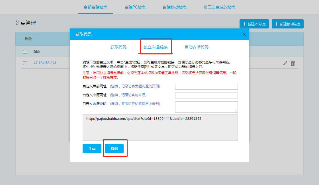 (其中获取代码是以弹窗效果在客户端展示,独立沟通链接是以跳转页面方式在客户端展示)