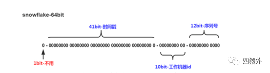 这种方案大致来说是一种以划分命名空间(UUID 也算,由于比较常见,所以单独分析)来生成 ID 的一种算法,这种方案把 64-bit 分别划分成多段,分开来标示机器、时间等,比如在 snowflake 中的 64-bit 分别表示如下图所示: