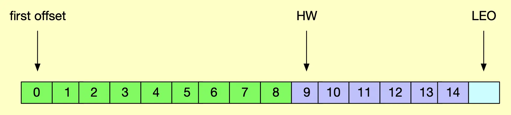 如上图所示,绿色部分表示已完全备份的消息,对消费者可见,紫色部分表示未完全备份的消息,对消费者不可见。