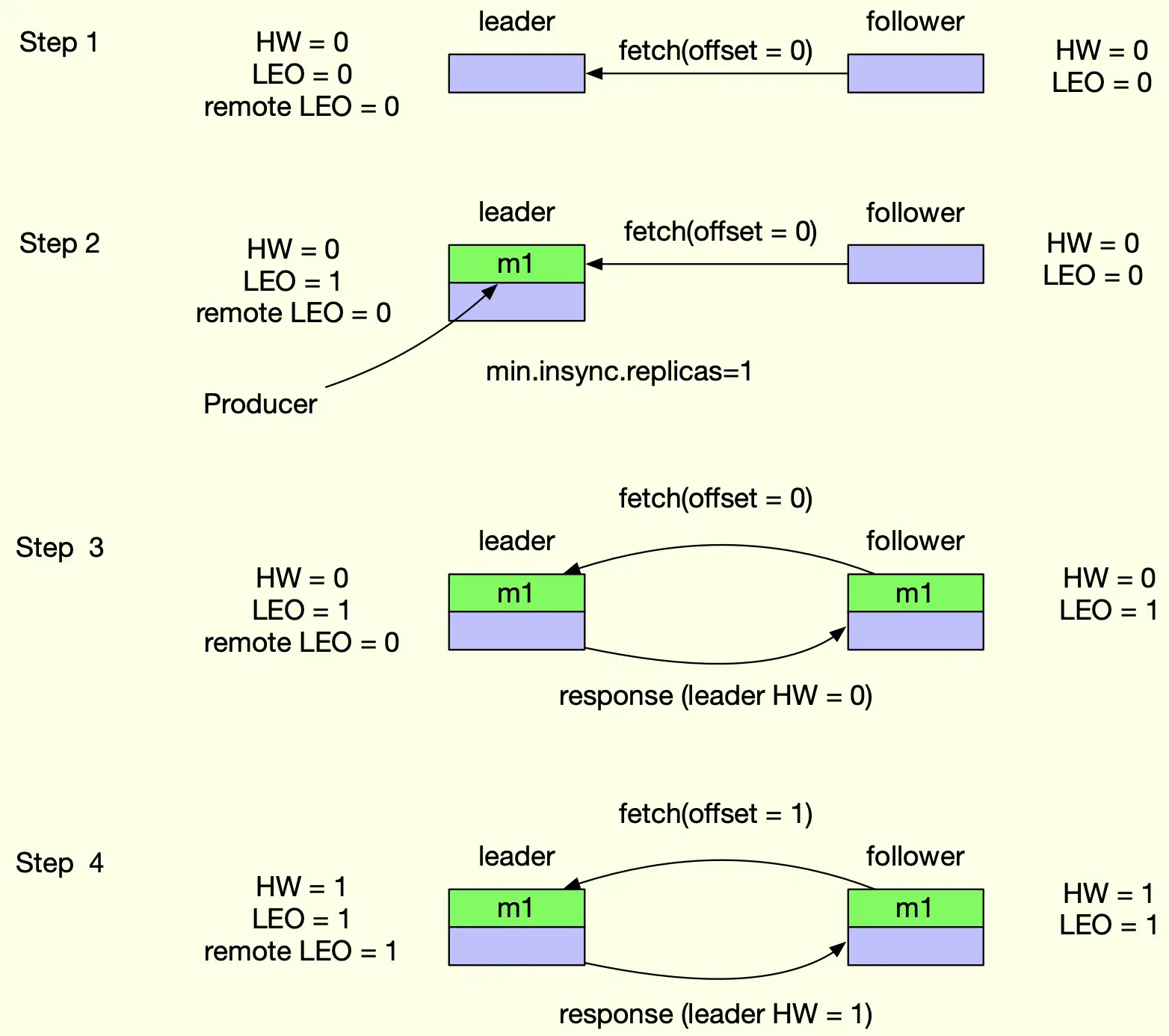 Step 3:follower 发送 fetch 请求,携带当前最新的 offset = 0,leader 处理 fetch 请求时,更新 remote LEO = 0,对比 LEO 值最小为 0,所以 HW = 0,leader 副本响应消息数据及 leader HW = 0 给 follower,follower 写入消息后,更新 LEO 值,同时对比 leader HW 值,取最小的作为新的 HW 值,此时 follower HW = 0,这也意味着,follower HW 是不会超过 leader HW 值的。