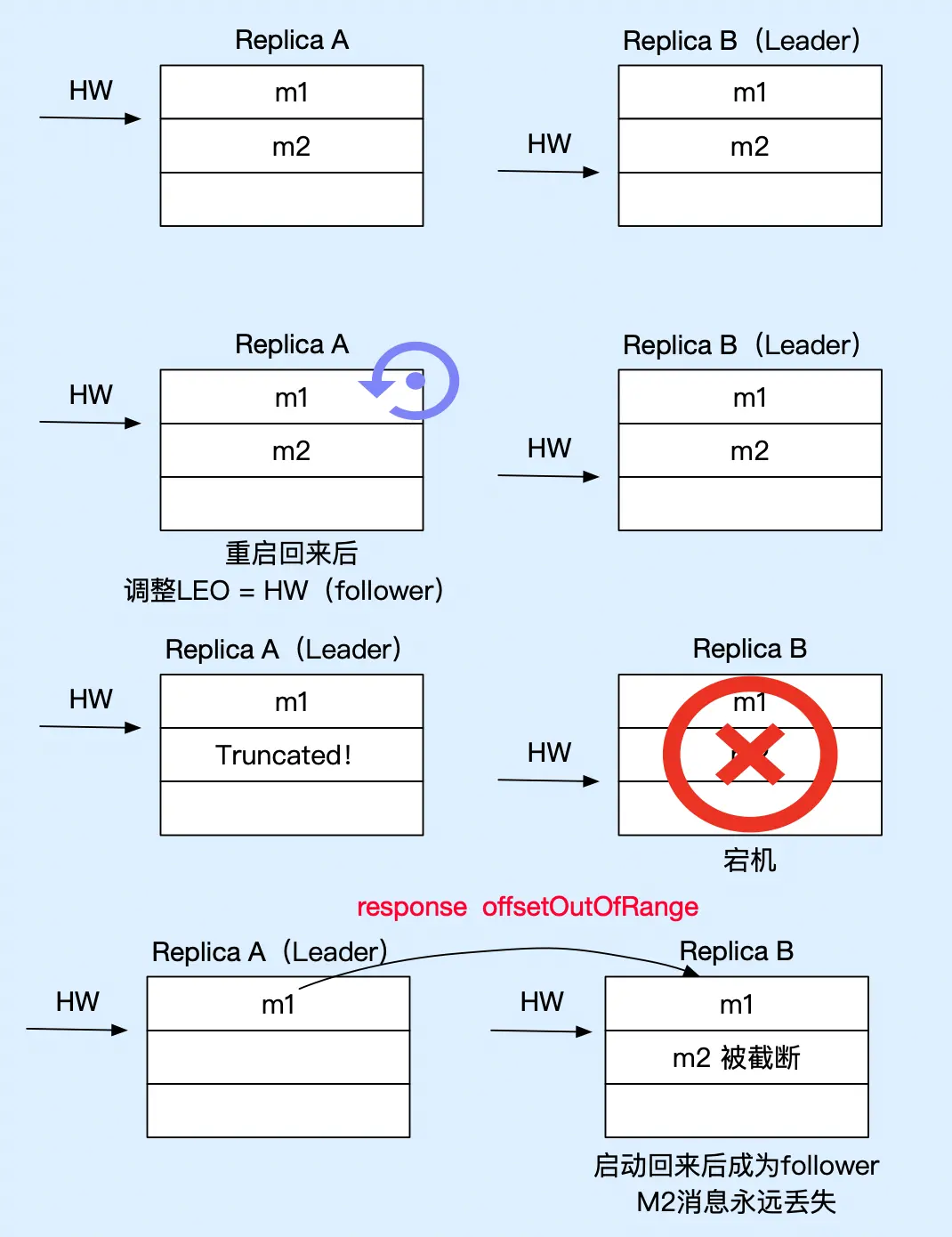 从以上步骤可看出,leader 中保存的 remote LEO 值的更新总是需要额外一轮 fetch RPC 请求才能完成,这意味着在 leader 切换过程中,会存在数据丢失以及数据不一致的问题,下面我用图来说明存在的问题: