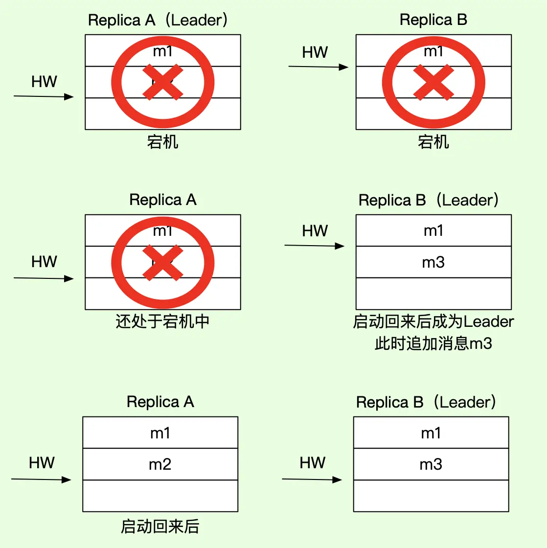 - 宕机之前,B 已不在 ISR 列表中,unclean.leader.election.enable=true,即允许非 ISR 中副本成为 leader;