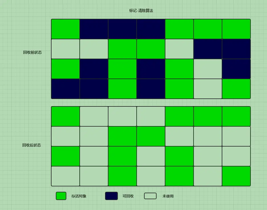 分为标记和清除两个阶段:首先标记出所有需要被回收的对象,在标记完成后统一回收所有被标记的对象。不足之处在于,标记-清除这两个过程的效率都不高,另一个是空间问题,标记清除之后会产生大量的不连续的内存碎片,空间碎片太多会导致以后程序运行时需要分配较大对象时,无法找到足够的连续内存而不得不提前出发一次垃圾收集动作。