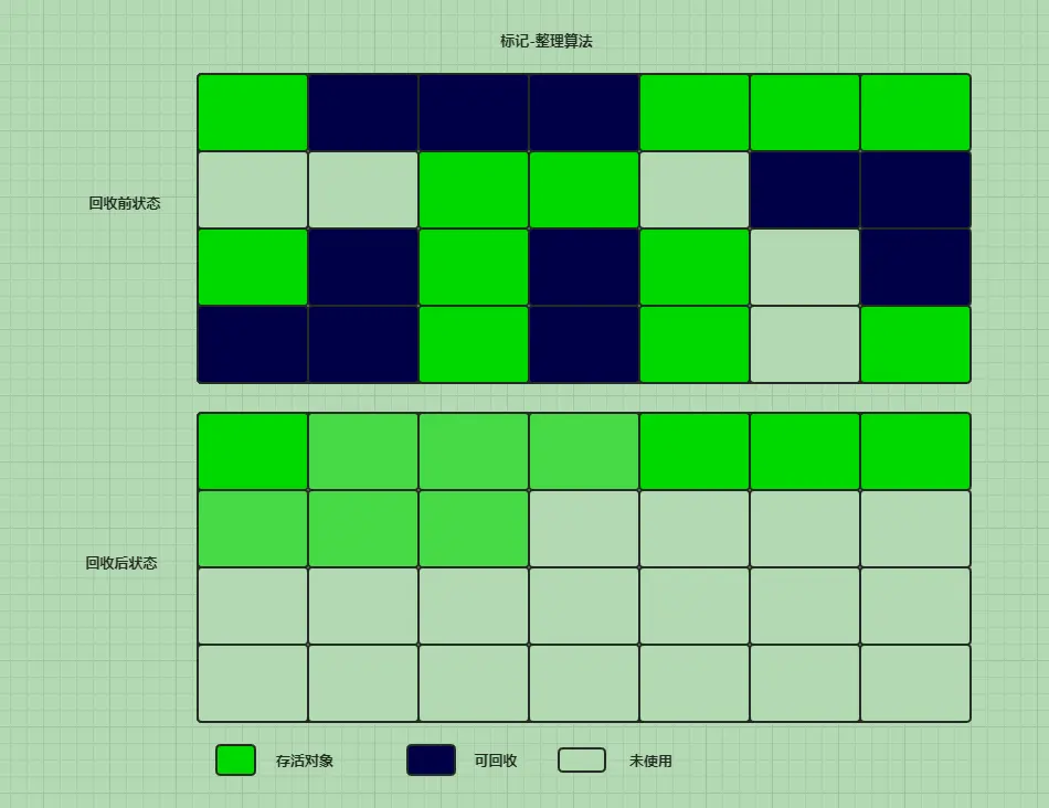 标记-整理算法过程和标记-清除算法一样,但是后续步骤不同,不是直接对可回收的对象进行清理,而是让所有存活的对象都向一端移动,然后直接清理掉边界以外的内存。