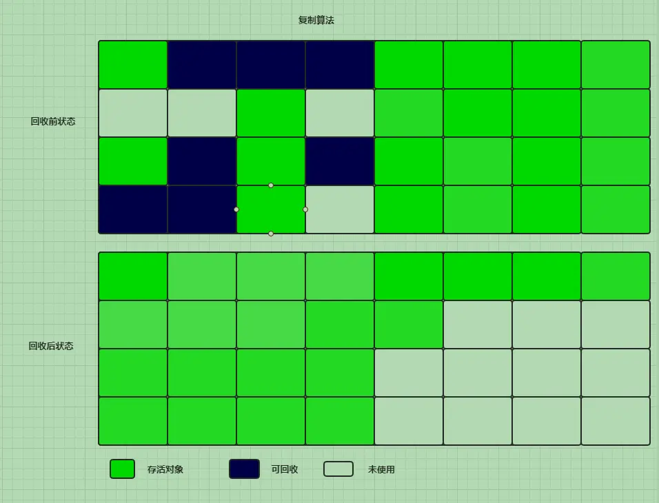 - 分代收集算法:根据对象存活周期的不同将内存划分为几块。一般把Java堆分为新生代和老年代,这样就可以根据各个年代的特点采用最适当的收集算法。例如,在新生代中,每次垃圾收集时都发现大批对象死去,只有少量存活,那么就可以采用复制算法,而老年代中的对象存活率高,没有额外的空间对它进行担保,那么就必须采用标记-清除或者标记-整理算法来进行回收。