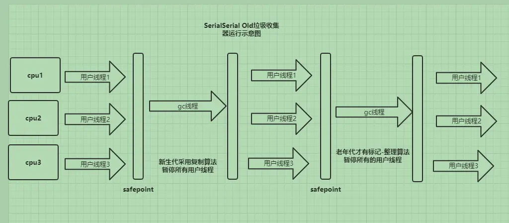 - Serial Old收集器:Serial收集器的老年代版本,单线程收集器,使用标记-整理算法。这个收集器主要在Client模式下的虚拟机使用的。