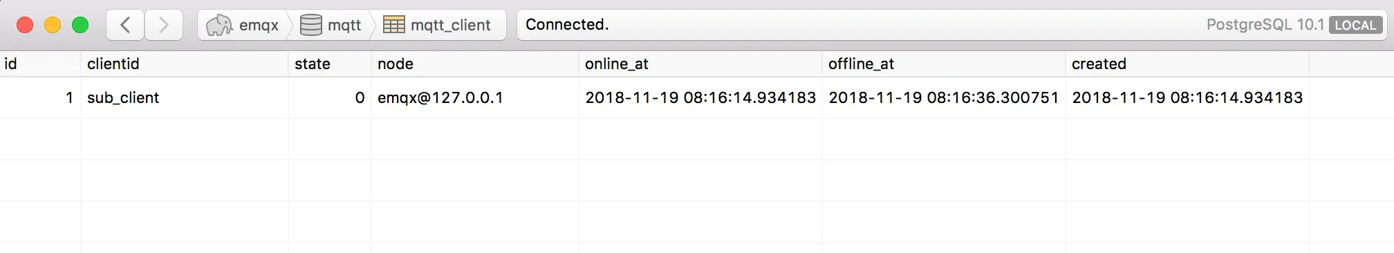 查看 mqtt_client 表,此时将写入 / 更新一条客户端上下线记录: