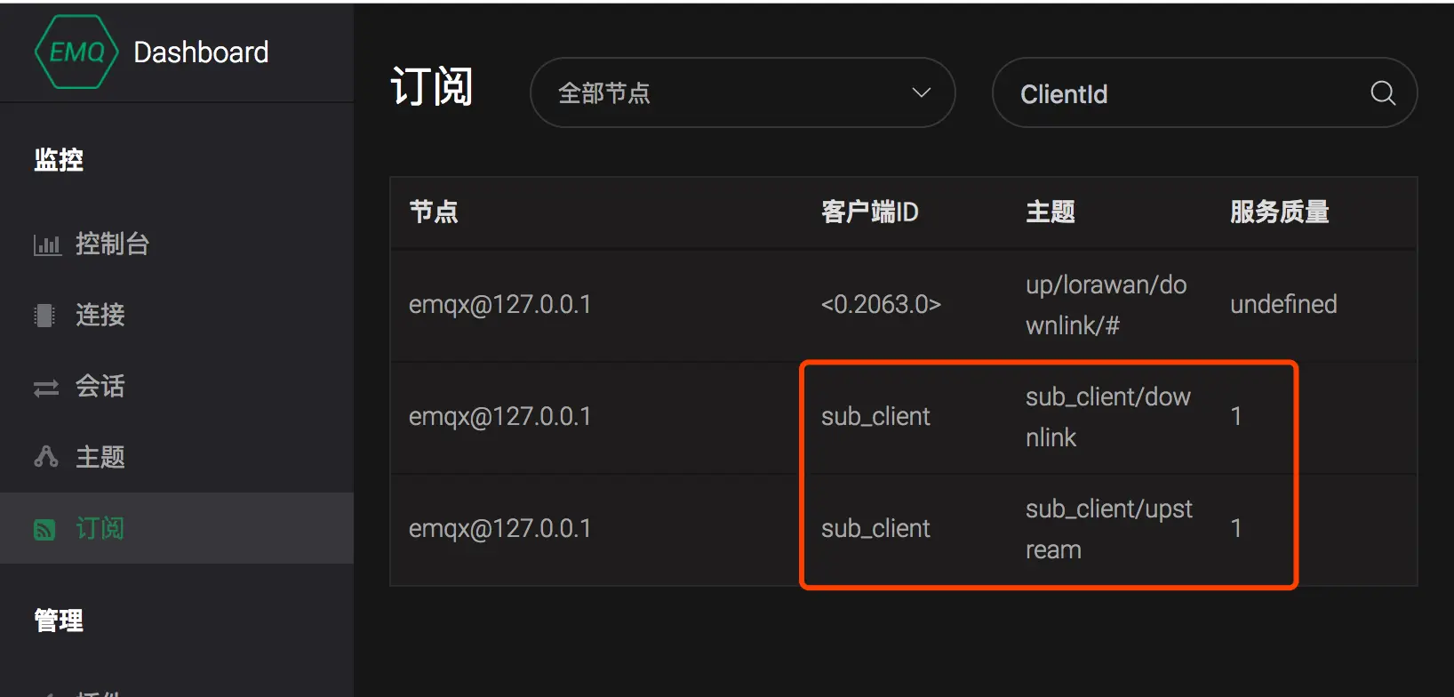 sub_client新建一个客户端连接,切换至订阅页面,可见当前客户端自动订阅了sub_client/upstream与sub_client/downlink两个 QoS 1 的主题: