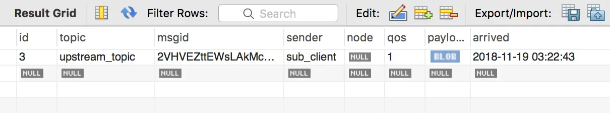 | message.publish | msgid, topic, payload, qos, clientid | insert into msg(msgid, topic) values(${msgid}, ${topic}) |