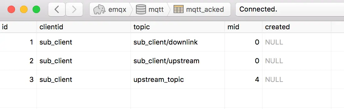 此时 mqtt_acked 表将插入初始化数据行,每向主题发布一条 QoS > 0 的消息,消息抵达后数据行 mid 将自增 1: