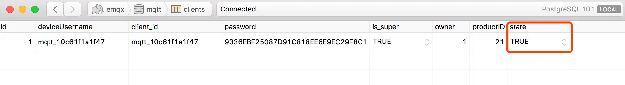 应用现有设备表 clients,具有设备连接认证、设备状态记录、设备管理等基本字段用于其他管理业务,现需要将 EMQ X 设备状态同步至该表中: