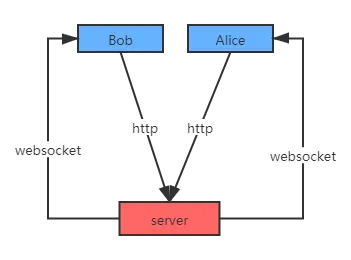 ws://{host}/ws/:name的websocket连接,其中name为消息发送者,当发送者改变时,关闭上一条连接,建立新的连接,例如消息发送方从Bob变为Alice, 则关闭ws://{host}/ws/Bob, 建立ws://{host}/ws/Alice, 这样我们就区分开了客户端,方便之后进行单点推送。