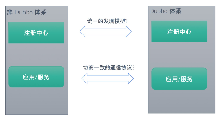 在这篇文章中,我们将以以上基础能力为背景,尝试突破 Dubbo 体系自身,探索如何利用 Dubbo 对多协议、多服务发现模型的支持,来实现异构微服务体系间的互联互通。在实际业务场景中,这可以用来解决异构技术体系共存场景下的通信问题,帮助公司实现在异构技术体系间作平滑迁移,解决大规模跨区域、多集群部署场景的地址发现及流量调度等问题。