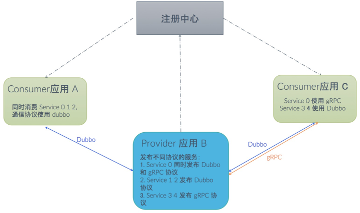 通过支持多种协议,借助注册中心的协调,可以快速满足公司内协议迁移的需求。如从自有协议升级到 Dubbo 协议,Dubbo 协议自身升级,从 Dubbo 协议迁移到 gRPC,从 REST 迁移到 Dubbo 协议等。