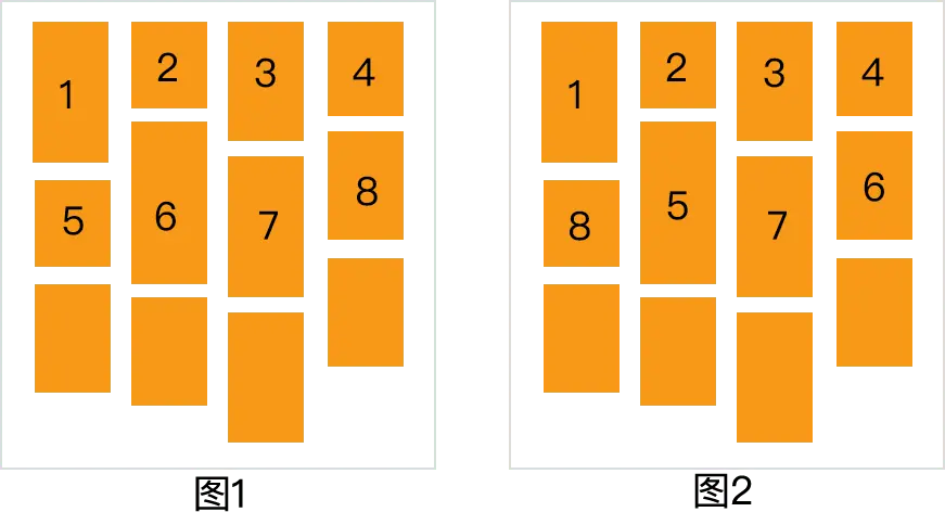 先看图 1 的排列顺序,第一排元素的顶部会处于同一个高度,依次排列在顶端,第一排排满之后,第二排从左往右排列。然而这种排列方式很容易出现其中一列过长或其中一列过短的情况。