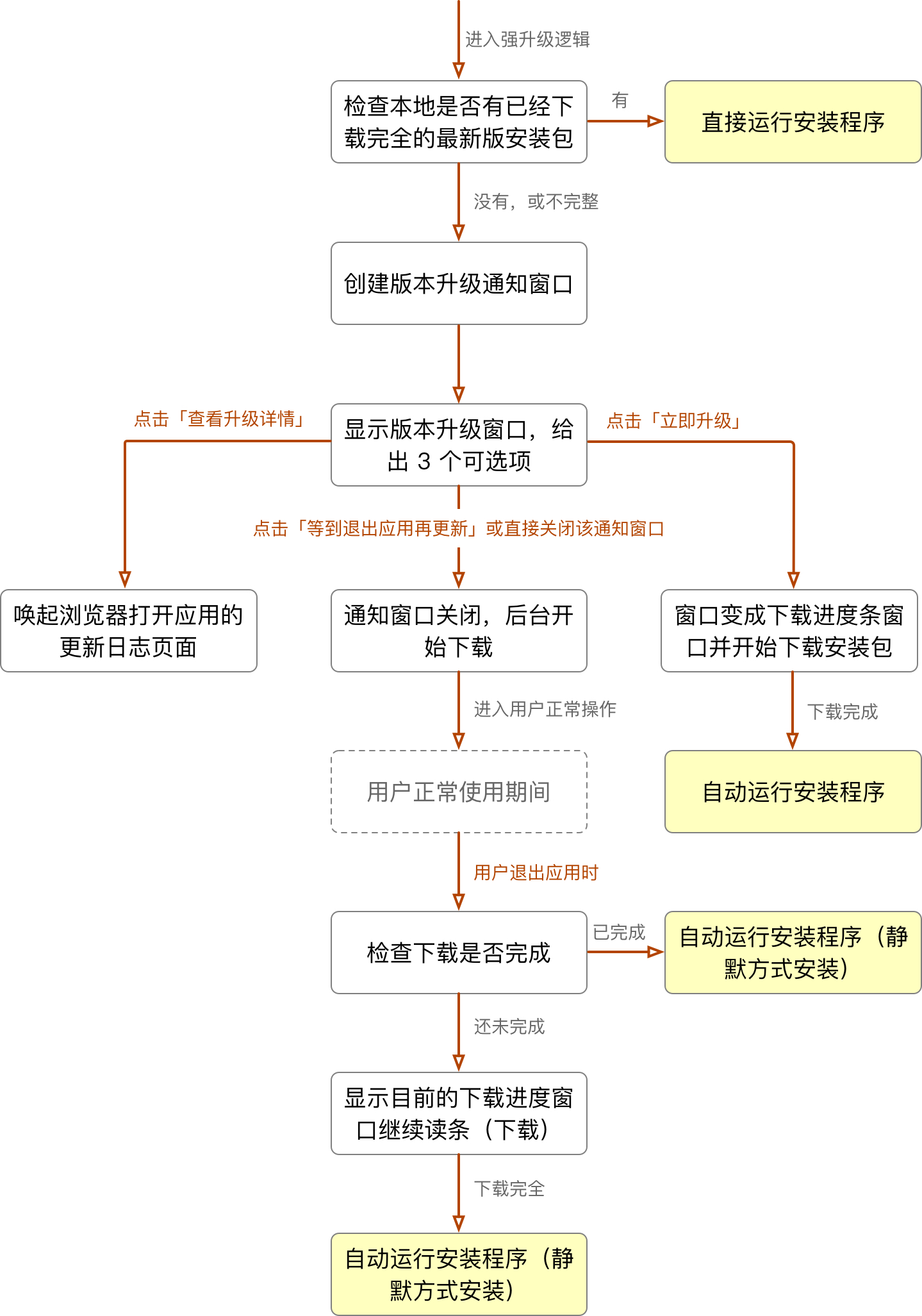 - 强升级下,选择「立即升级」,那么下载完成后自动开始安装;选择「退出应用再升级」,那么等退出应用后再自动运行安装程序(并且是静默的)