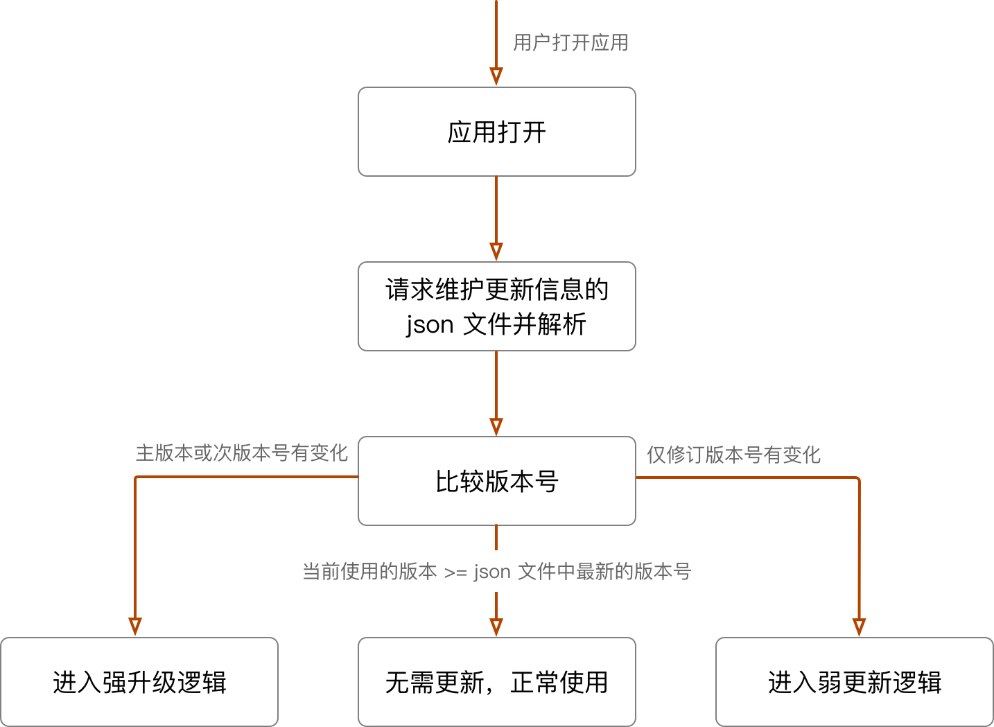 - 用户每次打开应用,应用会去请求这个 json 文件,对比最新的版本号和当前的版本号以检查是否有更新
