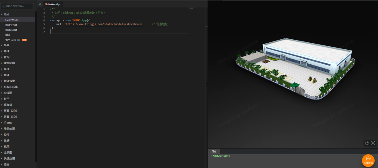 前端工程师完全可以玩儿转thingjs的,不用你大量敲代码,只需要通过上传模型,搭建场景,在线开发,对接数据就可以实施项目了。多说无益,来看一下开发界面吧: