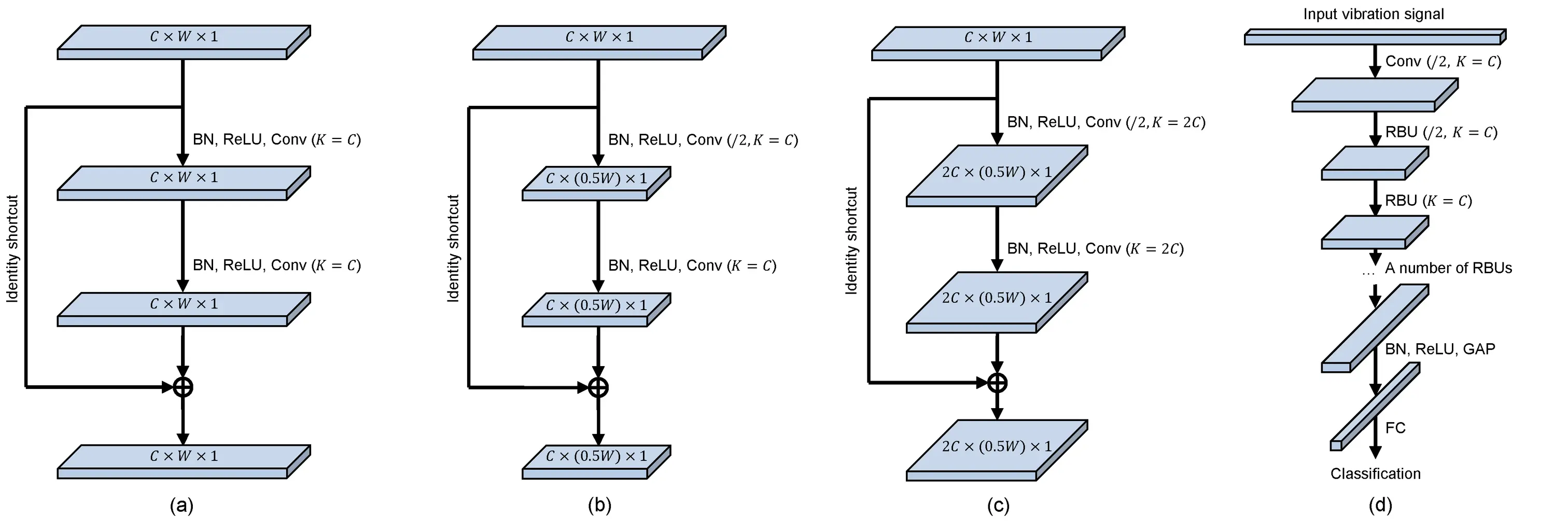 在下图中,(a)-(c)分别是三种残差模块,(d)是深度残差网络的整体示意图。BN指的是批标准化(Batch Normalization),ReLU指的是整流线性单元激活函数(Rectifier Linear Unit),Conv指的是卷积层(Convolutional layer),Identity shortcut指的是跨层的恒等映射,RBU指的是残差模块(Residual Building Unit),GAP是全局均值池化(Global Average Pooling),FC是全连接层(Fully Connected Layer)。