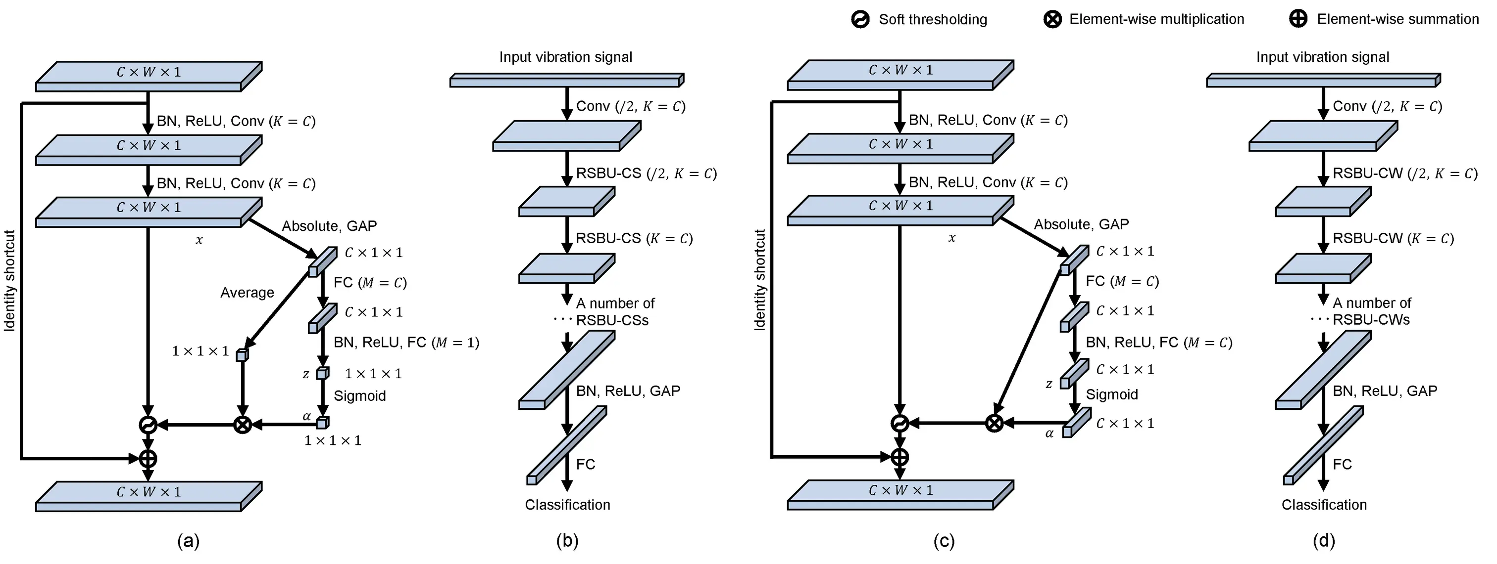 在下图中,(a)表示一种改进后的残差模块,名为“残差收缩模块-通道之间共享阈值(Residual Shrinkage Building Unit with Channel-shared thresholds,简称RSBU-CS)”;(b)表示的是DRSN-CS的整体结构示意图;(c)表示另一种改进后的残差模块,名为“残差收缩模块-逐通道不同阈值(Residual Shrinkage Building Unit with Channel-wise thresholds,简称RSBU-CW)”;(d)表示的是DRSN-CW的整体结构示意图。