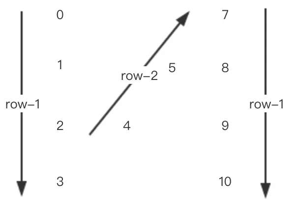 行 0 中的字符索引位置:n * (2 * numRows - 2);