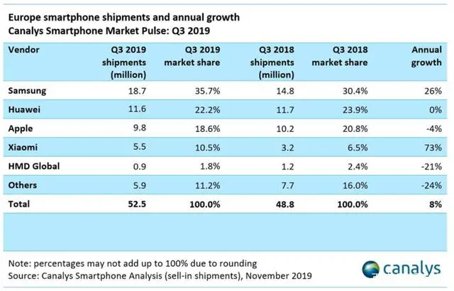 近日,知名市场调研机构 Canalys 发布了截止 9 月 30 日的欧洲智能手机市场 2019 Q3 的出货量报告。报告显示,欧洲市场在 2019 年 Q3 一共卖出了 5250 万台智能手机,比去年同比增长了 8%,从而使得它成为全球范围内同比增长幅度最大的区域,比亚太地区的 6% 还高了两个百分比。