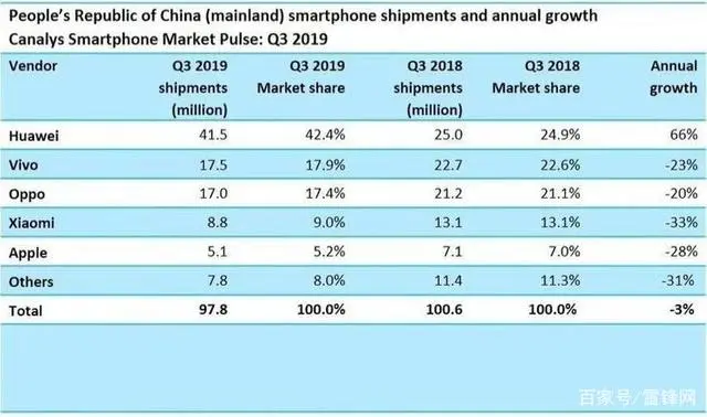 从中国国内的情况来看,华为(含荣耀品牌)智能手机的出货量达到了 4150 万部,同比增加了 66%,市场份额占比高达 42.4%——这是华为连续六个季度在中国智能手机市场的同比增长率达到两位数的百分比,而这一次的 66% 是一个令人震惊的增长比。同时,在华为一枝独秀的增长态势之下,其他几家排名靠前的厂商都出现了两位数百分比且不低于 20% 的份额下降。
