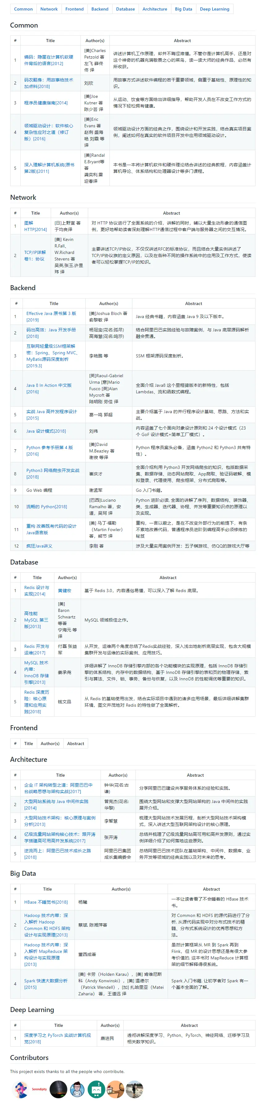 关于书籍,我推荐这一份“值得一看的技术书籍列表”。GitHub:github.com/doocs/techn…