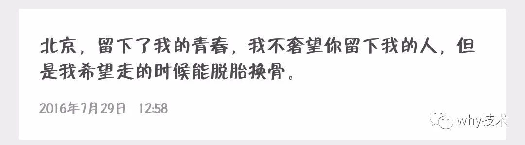 北漂就像在黑屋子里洗衣服,你不知道洗干净了没有,只能一遍又一遍地去洗。等到离开北京的那一刻,灯光亮了,你发现,如果你认真洗过了,那件衣服光亮如新。让你以后每次穿这件衣服都会想起那段岁月。