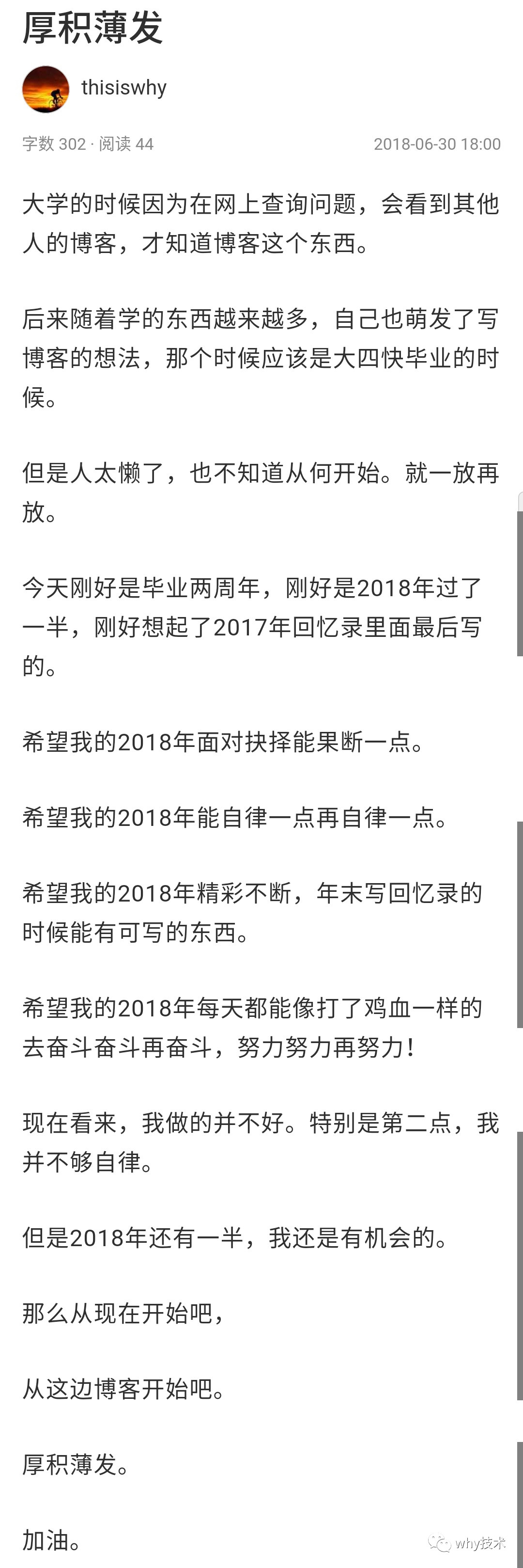 我给各大平台投稿的时候是这样写的:我在大学毕业的时候给自己定的目标是毕业三到五年后开一个订阅号,分享一些技术相关的东西。