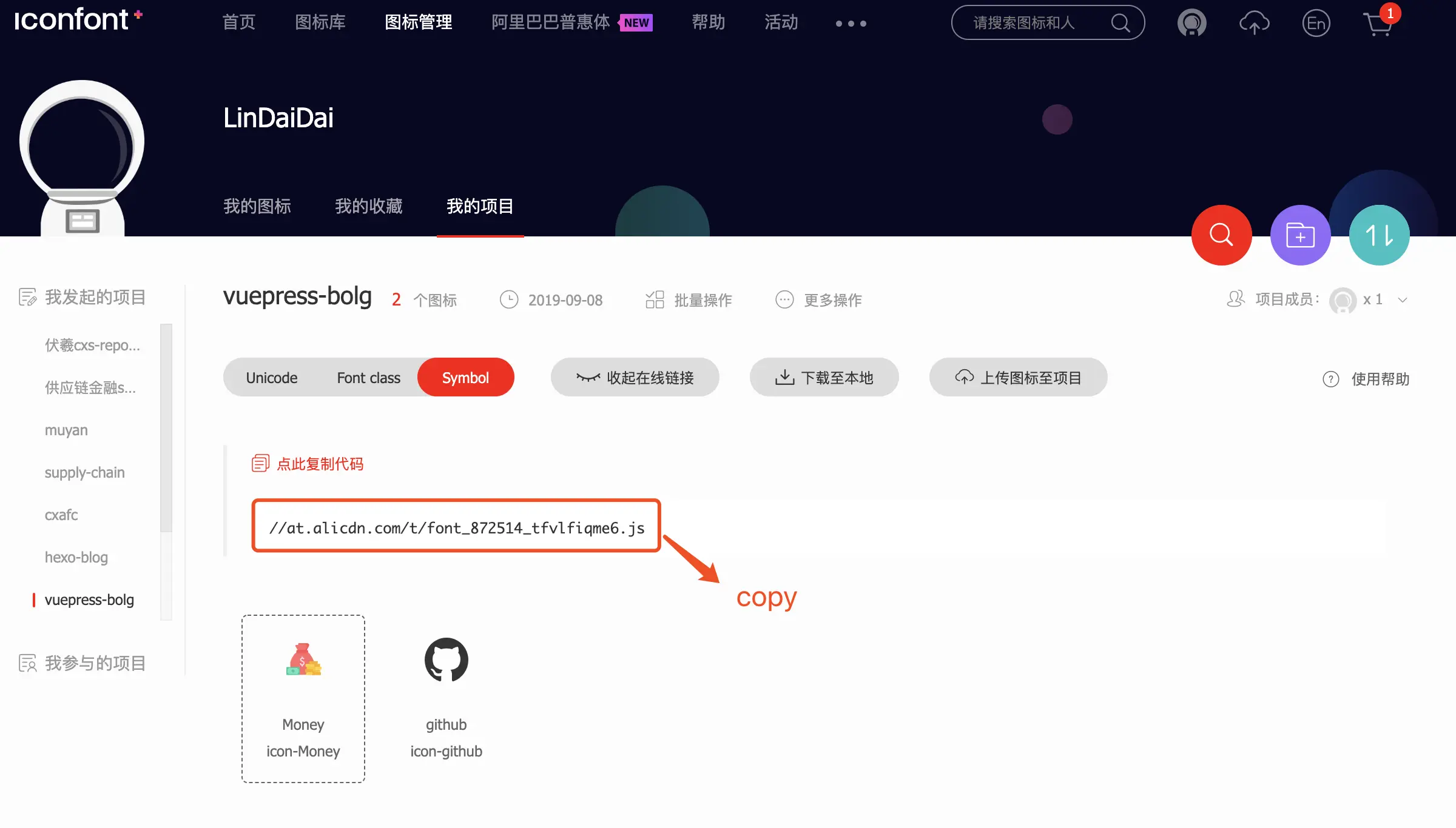 打开你iconfont上的项目,并找到Symbol的外部链接: