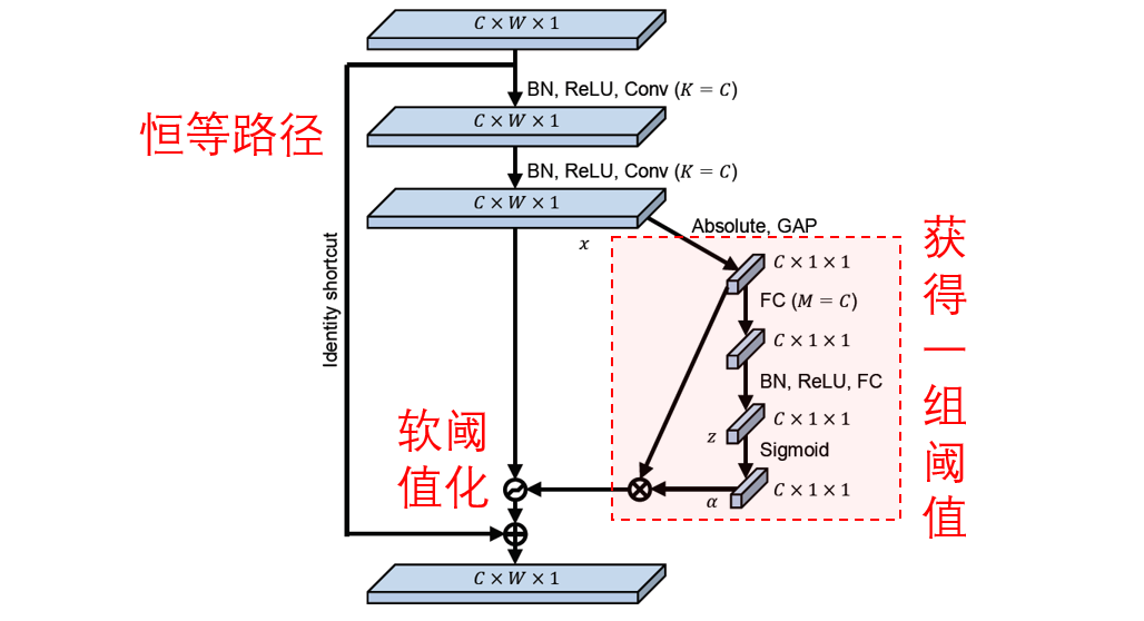 然后,在深度残差网络的基础上,深度残差收缩网络借鉴了Squeeze-and-Excitaion Network,引入了一个小型的子网络,利用这个子网络获得一组阈值,对特征图的各个通道进行软阈值化。这个过程其实可以看成一种可训练的特征选择的过程。换言之,就是通过前面的卷积层将重要的特征变成绝对值较大的值,将冗余信息所对应的特征变成绝对值较小的值;通过子网络获得二者之间的界限,并且通过软阈值化将冗余特征置为零,同时使重要的特征有着非零的输出。