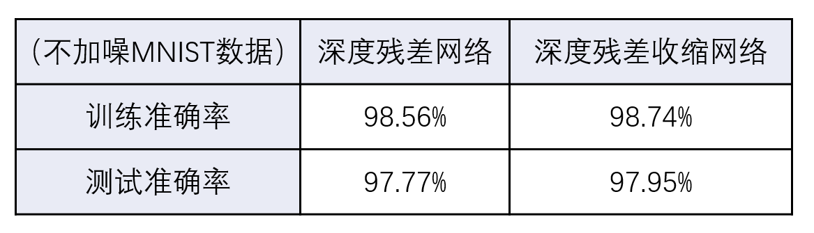 validation_acc = model.evaluate(testX, testY)[0]以上两个程序建立了只有1个基本模块的小型神经网络,MNIST图像数据中也没有人工添加任何噪声。准确率如下表所示,可以看到,即使是对于不含噪声的数据,深度残差收缩网络的结果也是不错的: