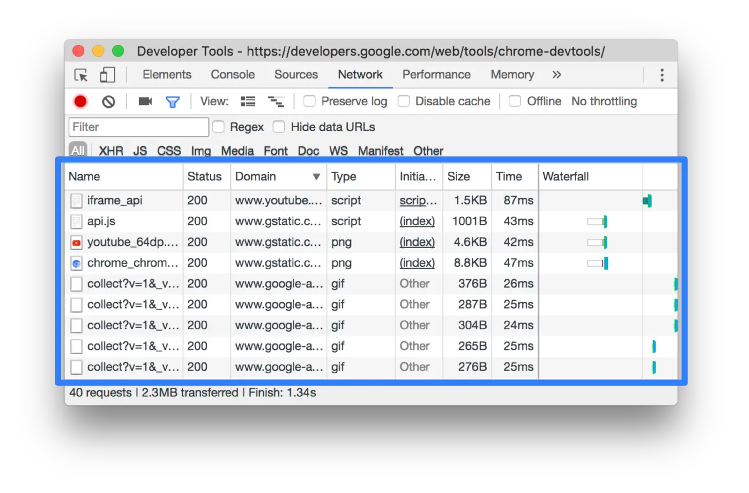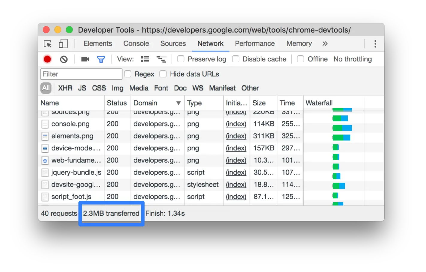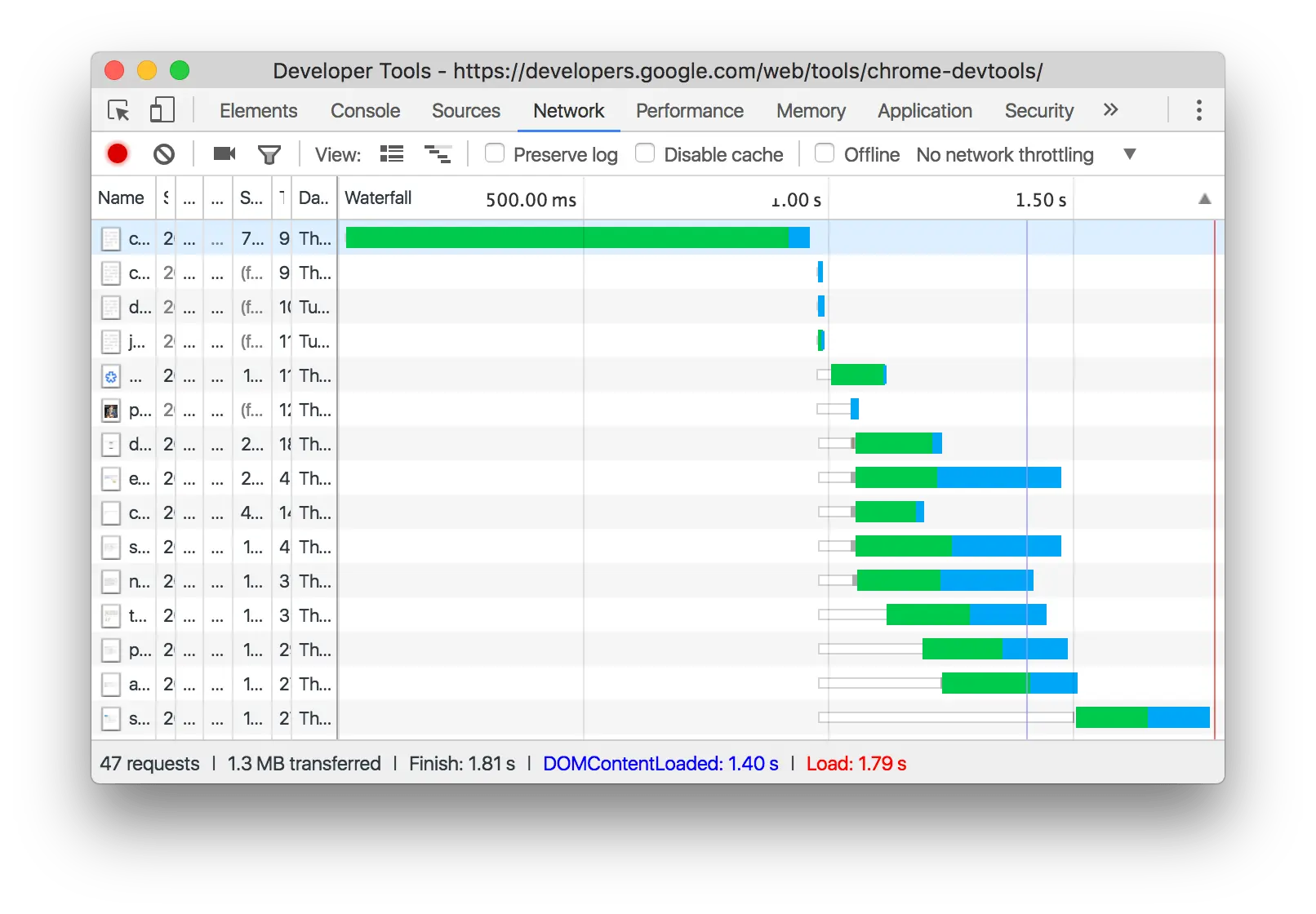 通过waterfall我们可以知道我们的页面资源和请求是否是合理的。一个良好的网站的waterfall应该类似于下面这样: