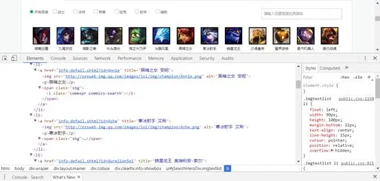 若要爬取全部英雄,我们先要获取这些英雄的信息,在网页上“右击——检查——Elements”,就能在看到英雄的信息了,如下图所示,包括英雄昵称、英雄名称、英文名等等。由于这些信息是使用JavaScript动态加载的,普通爬取方法无法获取,我们考虑使用虚拟浏览器PhantomJS来获取这些信息。