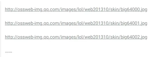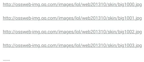 可以总结出这样一条规则:壁纸地址由三部分组成,固定地址+英雄id+壁纸编号。 固定地址:
