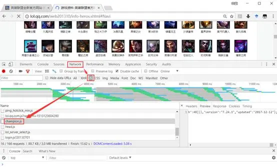 1.2英雄ID 在上面的过程中,我们已经基本了解了要爬取对象的信息了,但每一个英雄的id是多少却还不知道,在网页源代码和用JavaScript加载后都找不到英雄和id的对应信息,猜测这个信息可能是放在某个js文件里,我们来找一找。 在所有英雄信息界面“右键——检查——Network”,再刷新一下界面,可以找到一个champion.js文件: