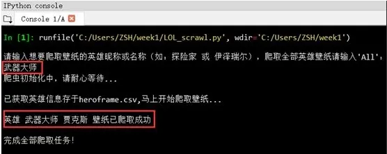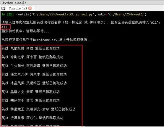 到这里就大功告成啦!只要运行一下这个小程序,所有英雄的皮肤壁纸就都收入囊中了,当然也可以爬取单个英雄的所有皮肤,只要根据提示输入英雄的昵称或名称就好。 爬取单个英雄皮肤壁纸: