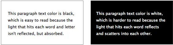 人眼的工作原理很像摄像机的镜头:当我们看到正极性的东西时,瞳孔收缩:我们看到的物体会更加锐利和细致。相反,当我们看到负极性的东西时,进入眼睛的光线会减少,这导致我们的瞳孔扩张:物体看上去会更加模糊。黑色背景上的白色文字显得更大,并且有一种光晕,这是因为单个字母发出的光被其它字母反射。这在一定程度上使负极性的东西难以观察。相反,正极不会产生这种现象。多项测试表明,对正极性的文本进行校对、速读等会更好(详见 TidBits 以及 Wired 上的相关文章)。此外,负极性的阅读更加困难,意味着我们的眼睛和大脑必须更专注,这导致我们更容易感到眼睛疲劳和头痛。