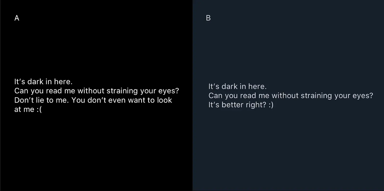 已经有很多文章谈到这个话题了,我们这里做一下总结(文章末尾有相关文章的链接)。不可否认,为 app 创建黑暗模式的时候必须遵循一些规则,否则就会大幅度地破坏用户体验。