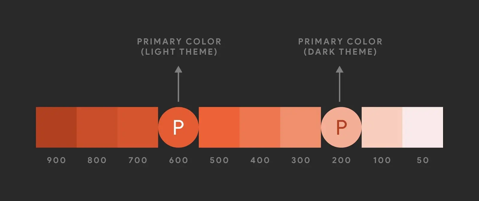 谷歌的 Material Design 建议在明亮模式中采用 200 号颜色,在黑暗模式中采用 500 号颜色。你可以在 WGAG 中检查对比度。