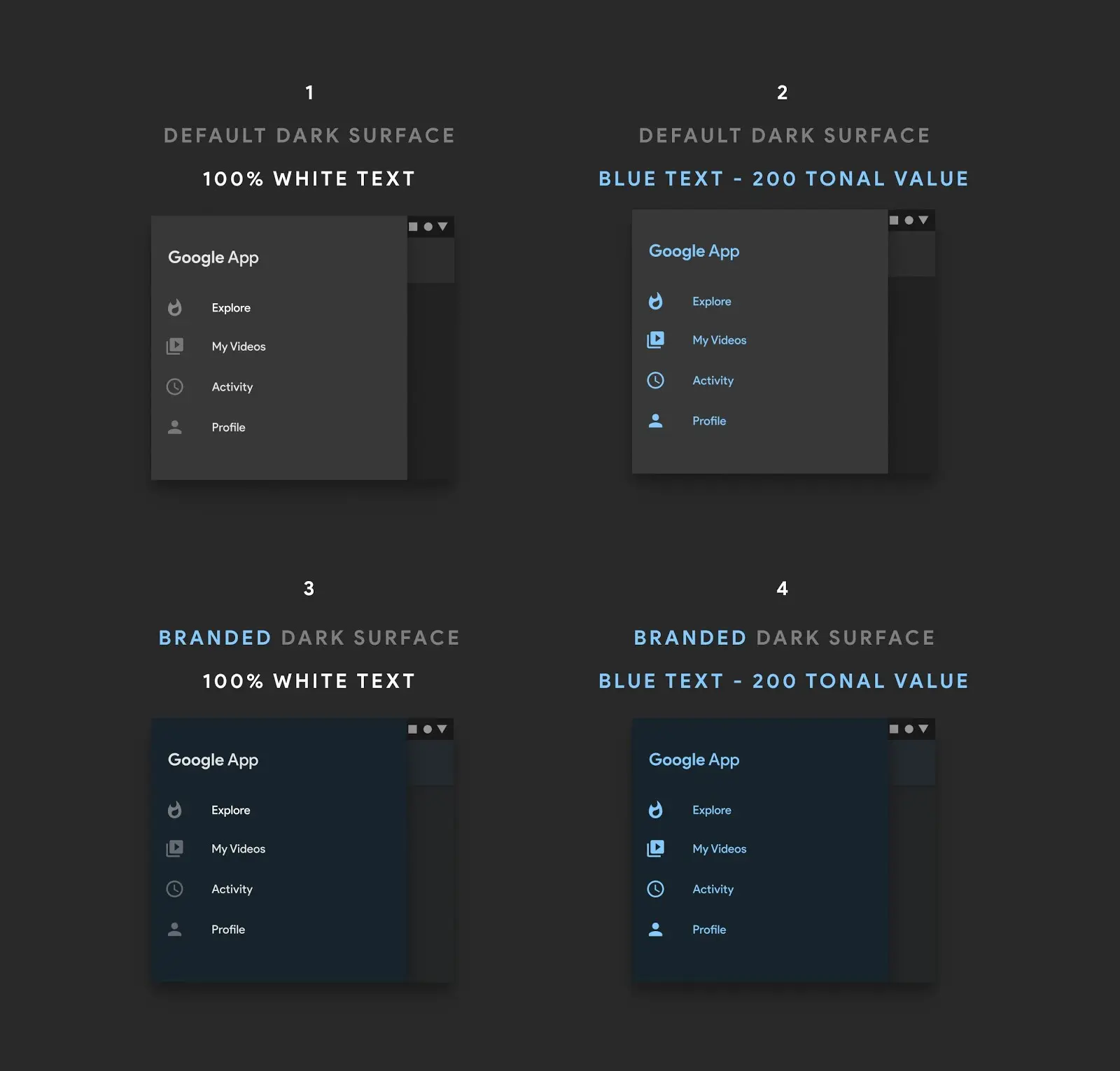 Material Design 建议使用 #121212 作为黑暗主题的背景颜色,因为纯黑色对眼睛很不友好。同理,文本颜色也要避免使用纯白色,而是降低透明度(Material Design 建议主要文本内容的透明度应为 87%),从而减少强烈的对比度。