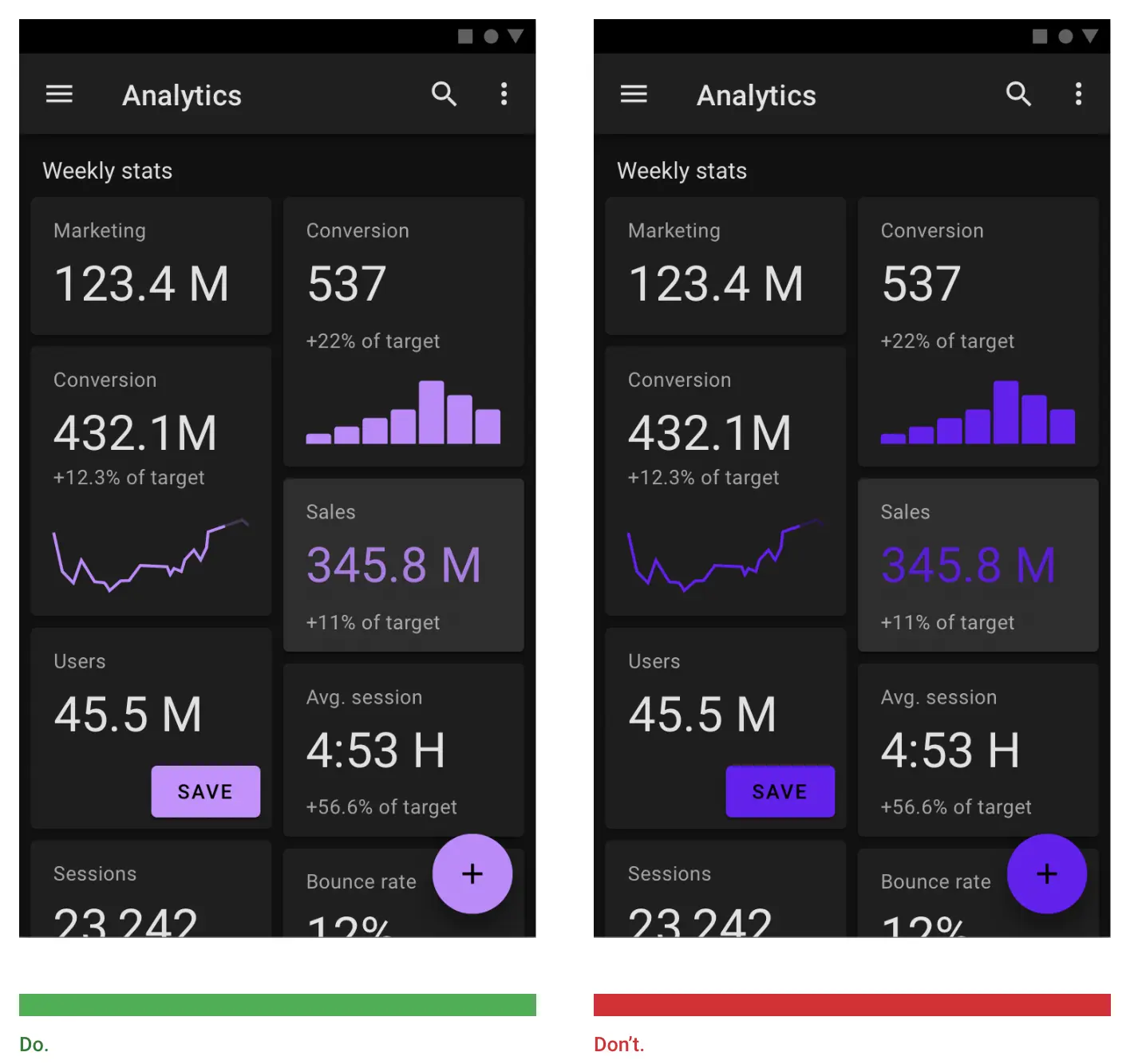 在黑暗模式中不宜采用过于饱和的颜色:它们太过明亮了,并且/或者会降低可读性。