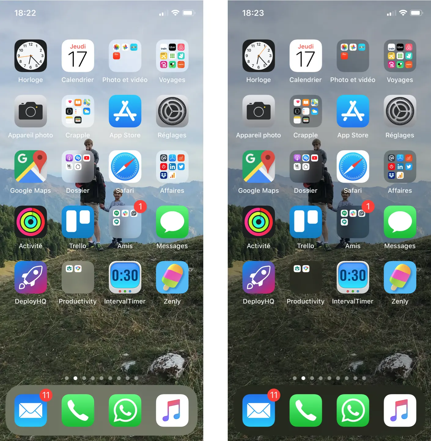 明亮模式和黑暗模式下,iPhone 的主屏幕