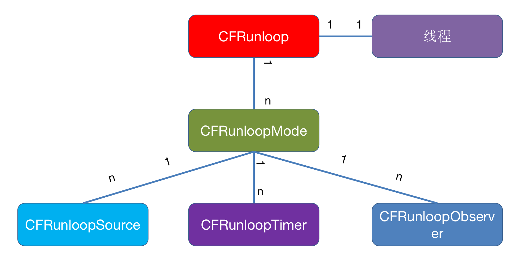 看到CFRunloopModelRef的结构体的成员中有,source0,source1,observers,timer,port等成员。CFRunLoopModeRef与CFRunloop的大致关系: